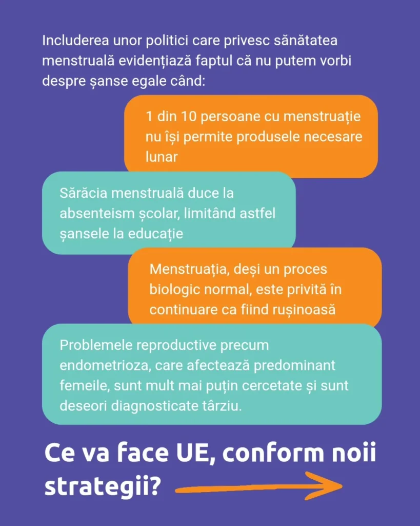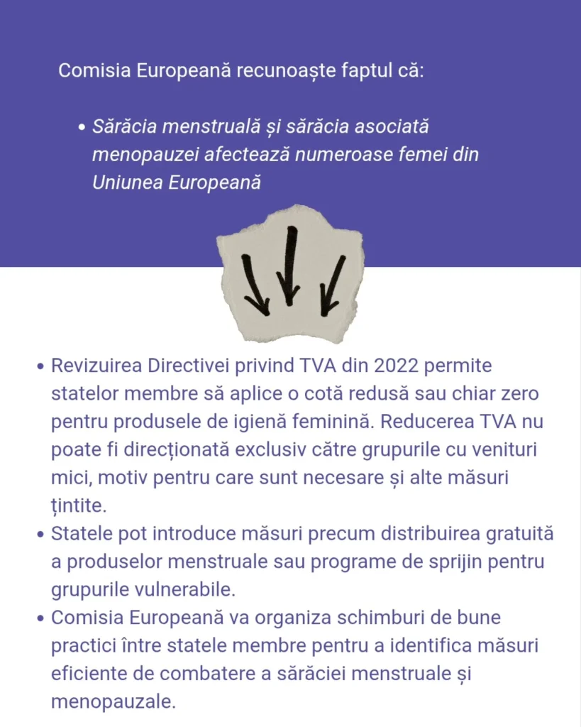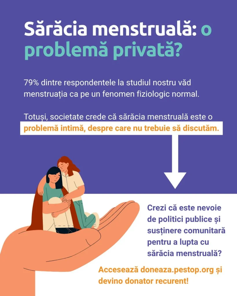- oferirea gratuită de produse menstruale pentru persoanele care nu au acces constant la ele.